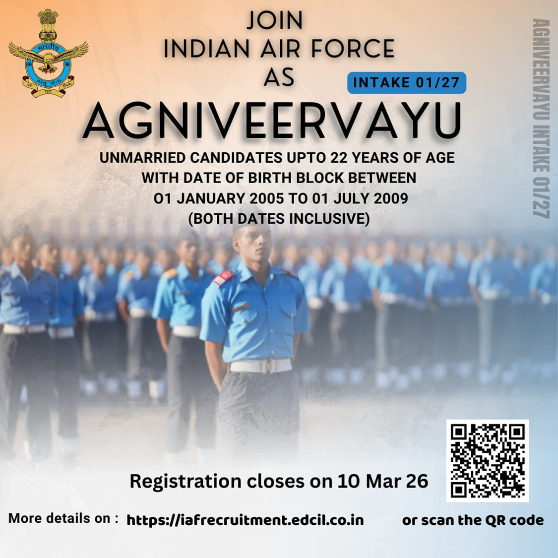 The Indian Air Force has released the official Agniveervayu Intake 01/2027 recruitment advertisement under the Agnipath Scheme, inviting eligible young Indian men and women to apply for the position of Agniveervayu โ€” a short-term defence engagement opportunity lasting four years.