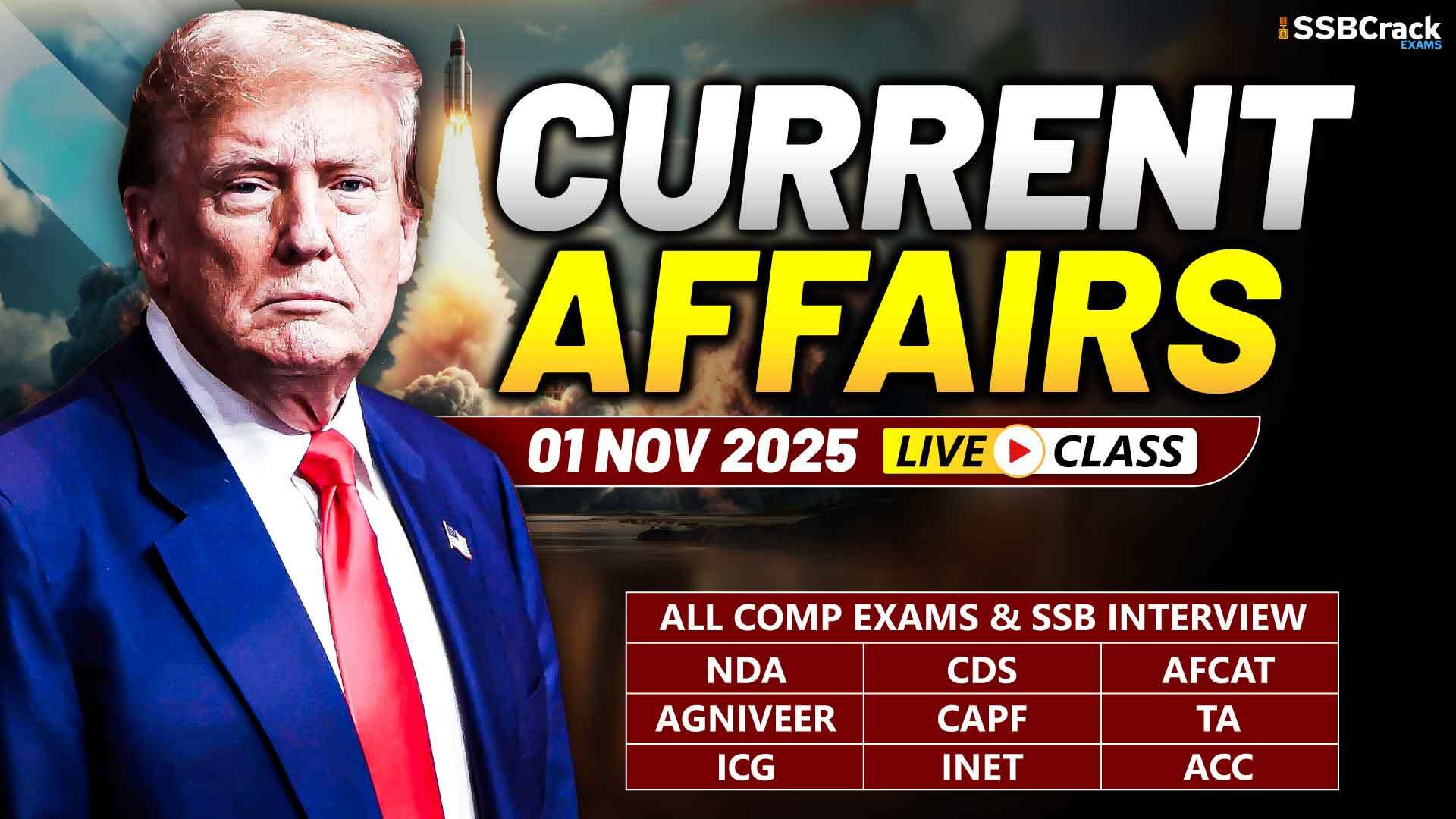 In Current Affairs for 01 November 2025, we will see the latest national and international current affairs news. These important current affairs will be beneficial for your upcoming NDA, CDS, CDS OTA, AFCAT, TA, Agniveer Army, Agniveer Navy, Agniveer Air Force, Women Military Police, INET, MNS, ACC exams, SCO, PCSL, CAPF, and SSB interviews, and direct entries for Army, Navy, and Air Force like SSC Tech, TGC, JAG, NCC, TES, 10+2 Cadet. Download a PDF file about current events at the end of this article. Let us now see the Current Affairs.