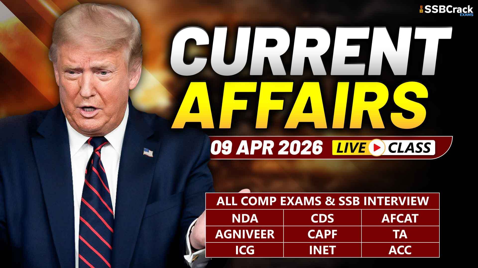 In Current Affairs for 09 April 2026, we will see the latest national and international current affairs news. These important current affairs will be beneficial for your upcoming NDA, CDS, CDS OTA, AFCAT, TA, Agniveer Army, Agniveer Navy, Agniveer Air Force, Women Military Police, INET, MNS, ACC exams, SCO, PCSL, CAPF, and SSB interviews, and direct entries for Army, Navy, and Air Force like SSC Tech, TGC, JAG, NCC, TES, 10+2 Cadet. Download a PDF file about current events at the end of this article. Let us now see the Current Affairs.