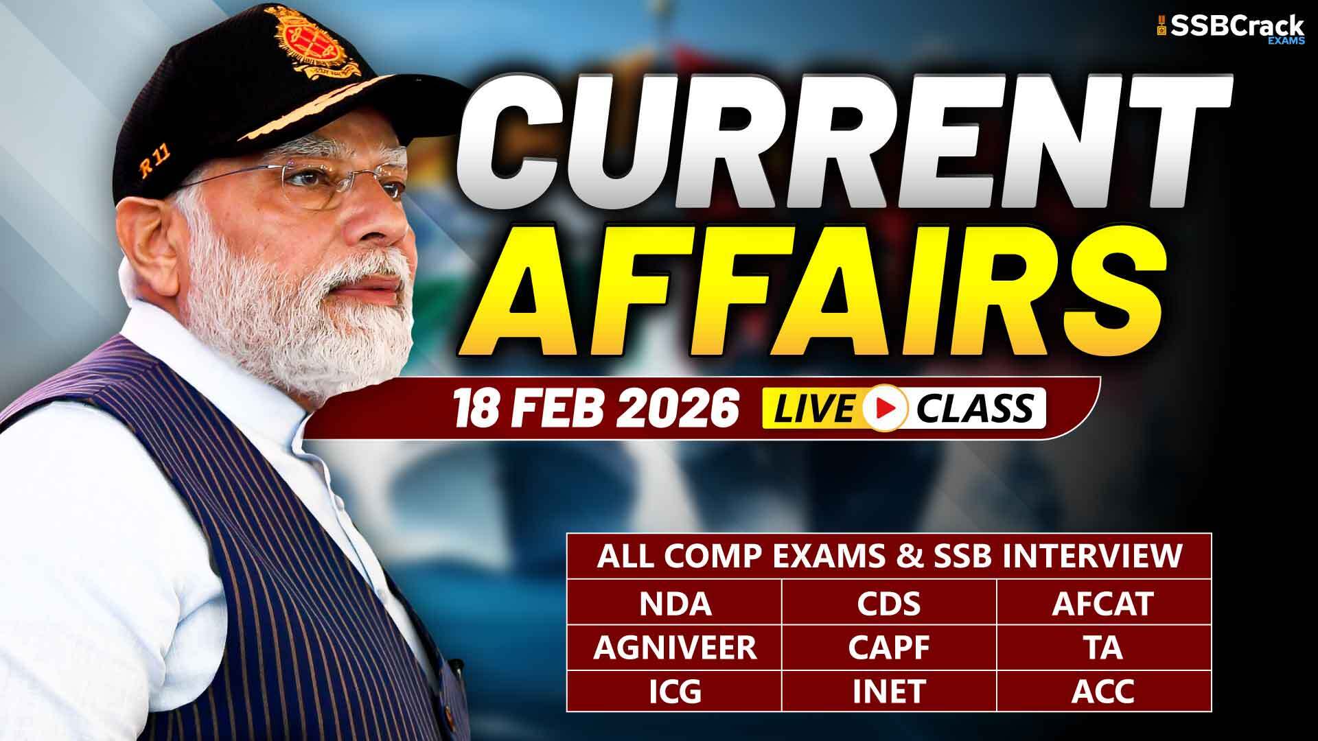 In Current Affairs for 18 February 2026, we will see the latest national and international current affairs news.  These important current affairs will be beneficial for your upcoming NDA, CDS, CDS OTA, AFCAT, TA, Agniveer Army, Agniveer Navy, Agniveer Air Force, Women Military Police, INET, MNS, ACC exams, SCO, PCSL, CAPF, and SSB interviews, and direct entries for Army, Navy, and Air Force like SSC Tech, TGC, JAG, NCC, TES, 10+2 Cadet. Download a PDF file about current events at the end of this article. Let us now see the Current Affairs.