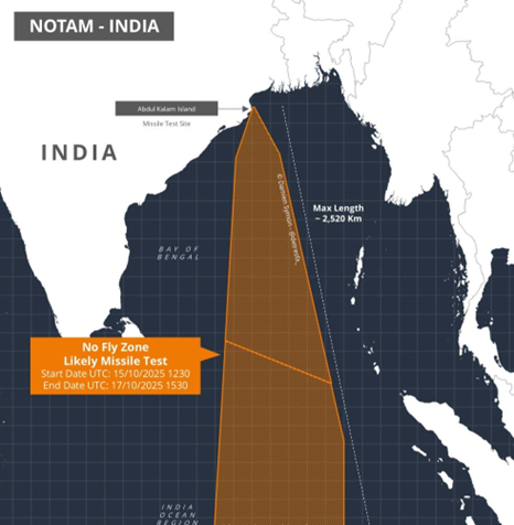 India has released a new Notice to Airmen (NOTAM) and maritime safety advisory establishing an extended danger zone over the Bay of Bengal, covering a maximum range of around 2,520 km. The test window, scheduled between 15 and 17 October 2025, indicates preparations for a potential long-range missile trial.
