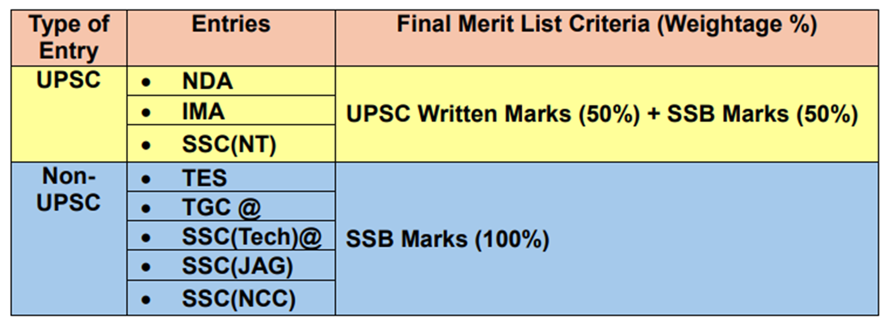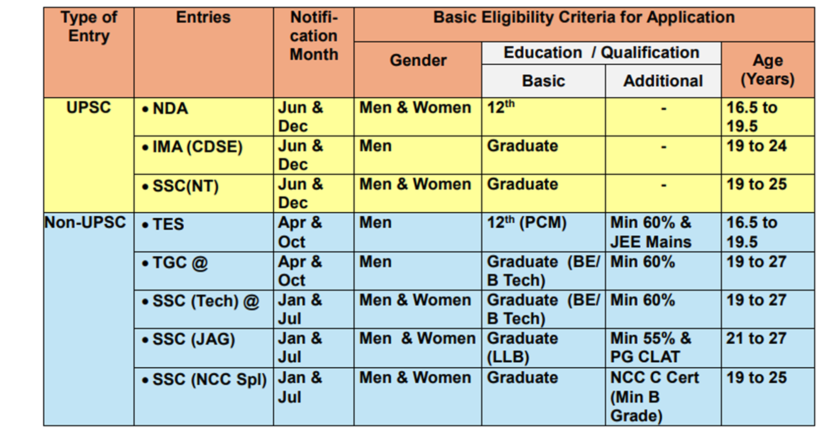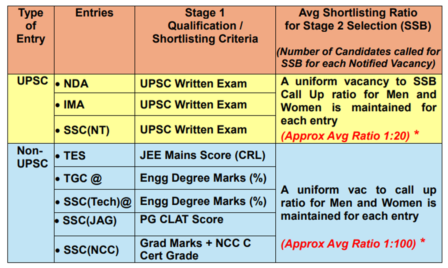โขUPSC entries: Candidates appear for exams such as NDA/NA or CDS, which are written tests assessing subjects like English, General Knowledge and Mathematics.